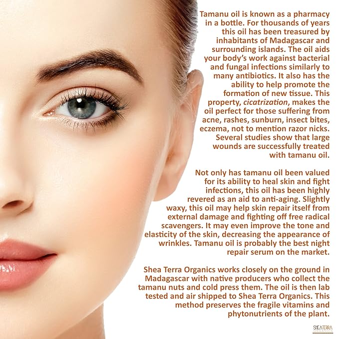 - Powerful Nutrients: Pure Madagascar Tamanu Extra-Virgin Oil contain properties that help fight nasty critters, as well as high amounts of polyunsaturated fat amino acids and fatty acids that aid in skin cell rejuvenation and wound closures.