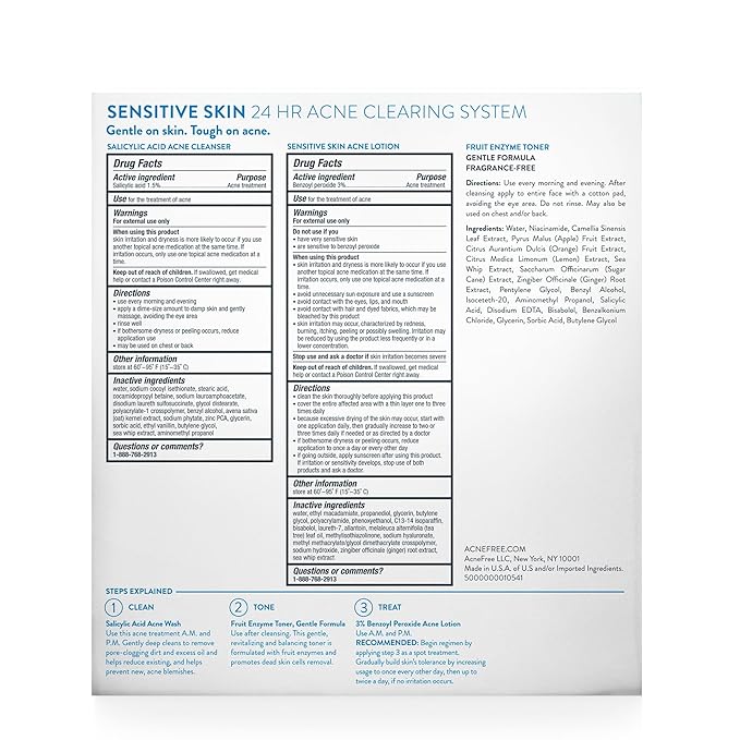 Acne Free 3-Step Acne Treatment Kit with Salicylic Acid Face Wash, Alcohol-Free Toner, & Benzoyl Peroxide Lotion for Sensitive Skin and Fighting Breakouts, 24 Hour Face Clearing System