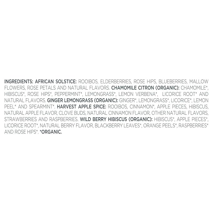 - HERBAL TEA ASSORTMENT with five varieties of our most popular, naturally caffeine-free, herbal tea blends - African Solstice, Chamomile Citron, Ginger Lemongrass, Harvest Apple Spice and Wild Berry Hibiscus.