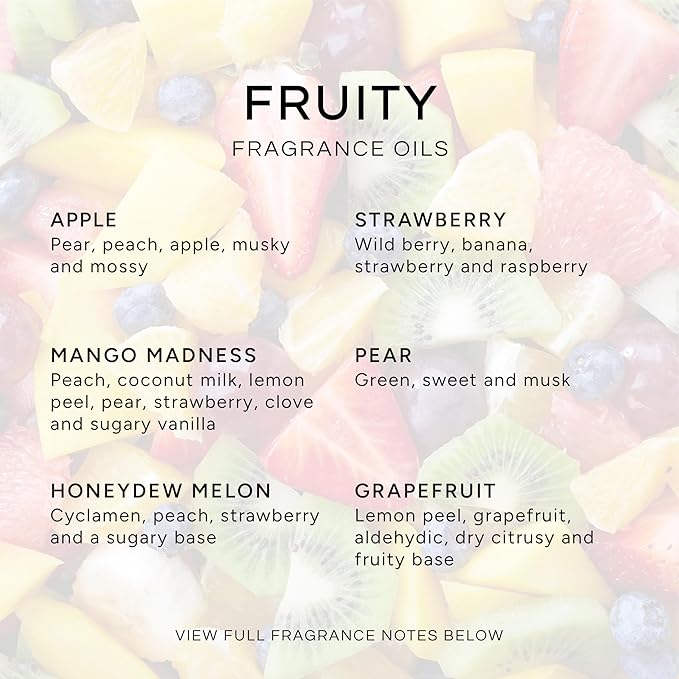 - FRUITY SCENTED OILS: Fresh fruity smelling scents formulated for making candles, soaps, air freshener sprays, aromatherapy diffusers, dryer sheets and cleaning products. These seasonal essential scents make the perfect gift for the whole family!