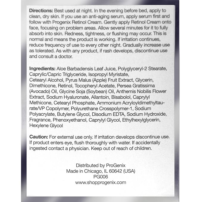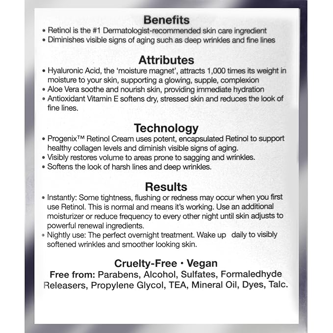 - Progenix anti-aging Retinol Cream is the perfect overnight treatment. Wake up to visibly softened wrinkles and smoother looking skin.