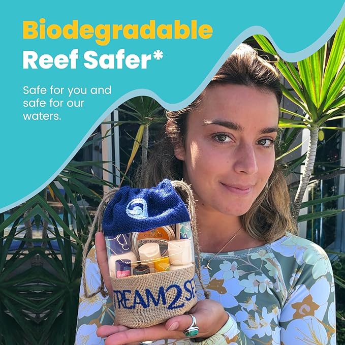 - Reef Safe, Biodegradable Travel Sized Gift Set; Our natural products are safe for use while camping and boating and is perfect for travel. Set Includes 1oz Travel Size Shampoo, Leave In Conditioner, SPF20 Sunscreen, SPF30 Tinted Mineral Sunscreen & Sting Relief Gel