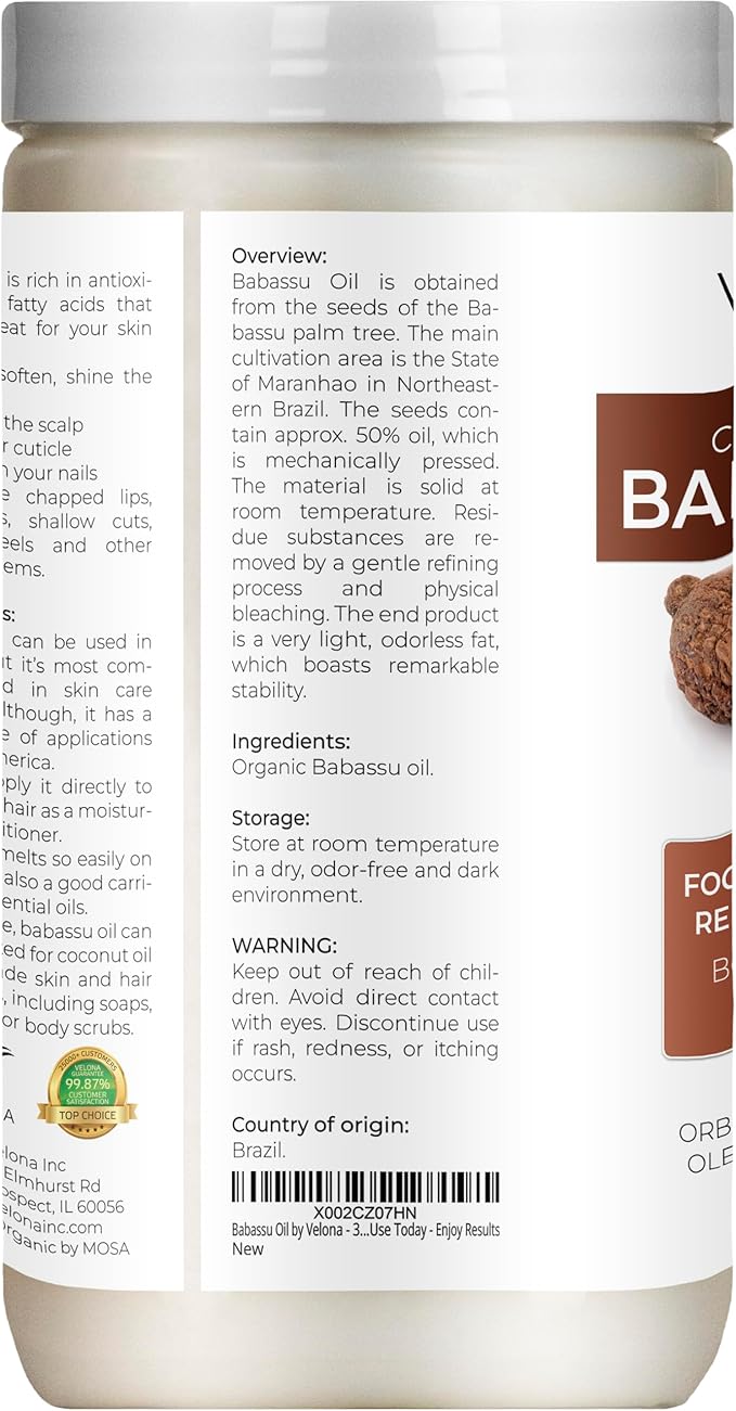 velona Babassu Oil USDA Certified Organic - 64 Fl Oz | 100% Pure and Natural Carrier Oil | Refined, Cold Pressed
