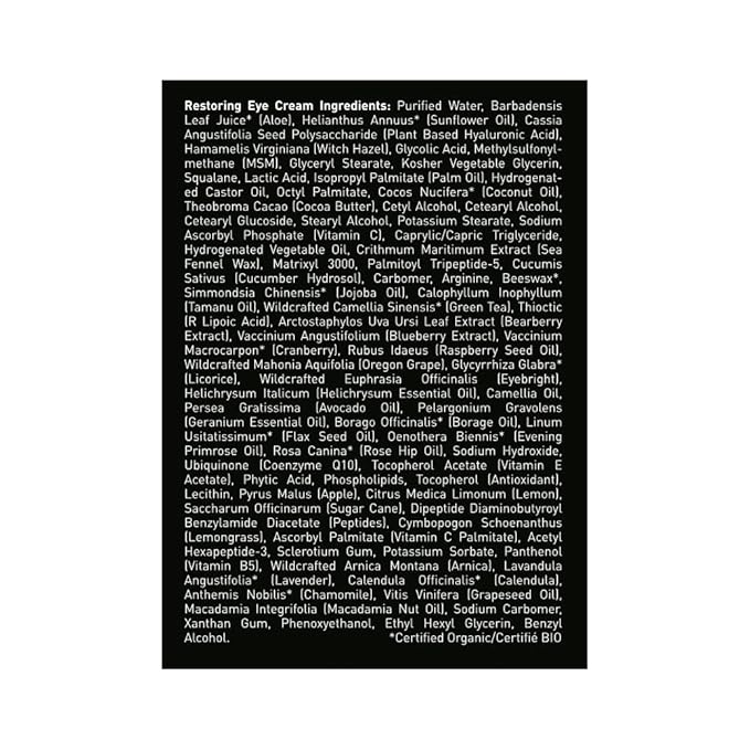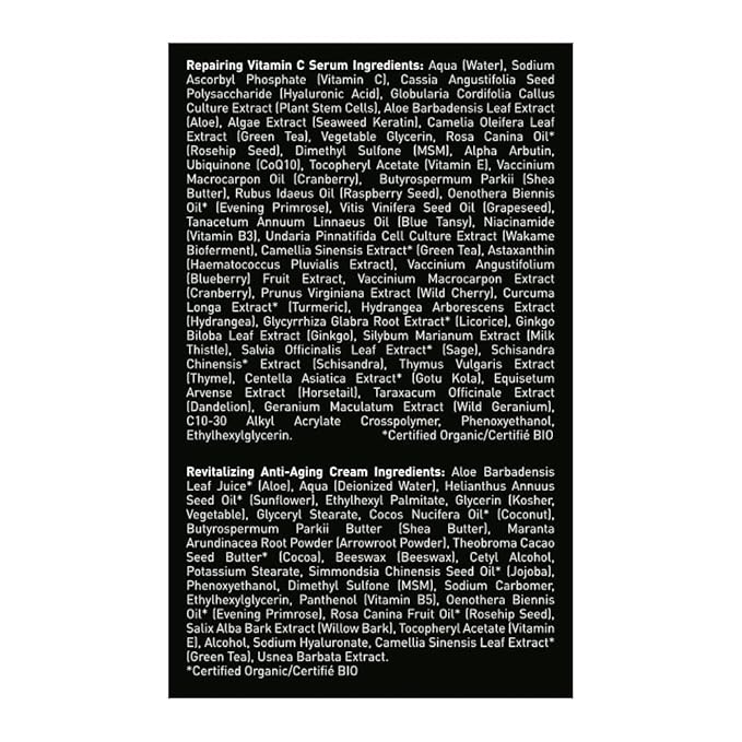 - Key Ingredients: Natural & Certified Organic ingredients, including aloe, DMAE, MSM, Plant Stem Cells, Vitamin C, hyaluronic acid, protein peptides, and caffeine.
