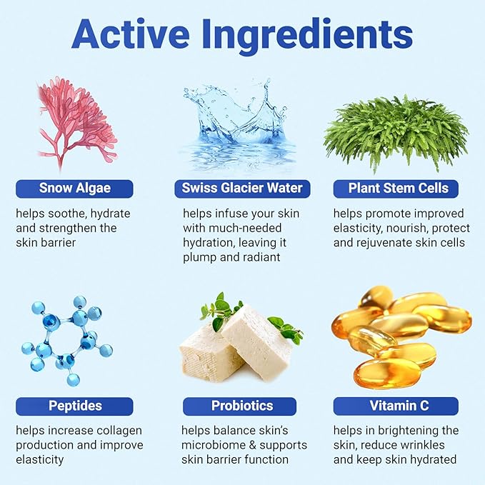 - POWERED BY NATURE AND SCIENCE: Infused with powerful ingredients like plant stem cells for face to improved elasticity, snow algae for skin structure enhancement, and Swiss glacier water for 24-hour hydration serum for face, our anti aging face serum is designed to firm, plump, and tighten while being cruelty-free and free from parabens and artificial fragrances. This Face wrinkle cream for women and men will not clog your pores and it will not make your skin feel oily or greasy.