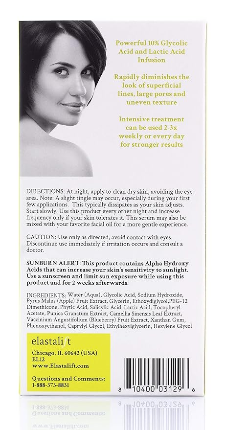 - UNCOVER A COVETED COMPLEXION – Retexturize, resurface, and reveal luminous skin with 1 simple treatment! Elastalift’s glycolic acid chemical face peel quickly and effectively eradicates your biggest insecurities, including age spots, hyperpigmentation, acne scars, and more.