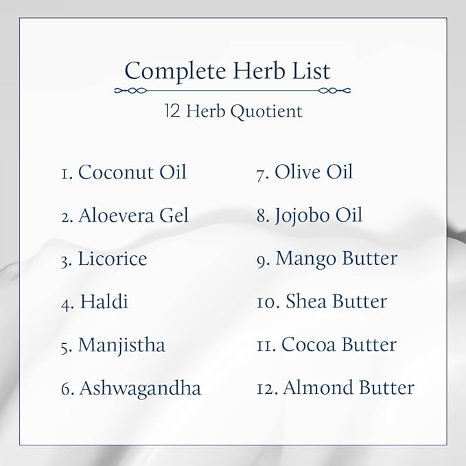 - Contains 12 Ayurvedic herbs like Aloevera, Turmeric, Ashwagandha, Olive Oil. Also contains Mango butter, Shea Butter, Almond Butter and Cocoa Butter. Free from Sulphate, Paraben and other harmful chemicals