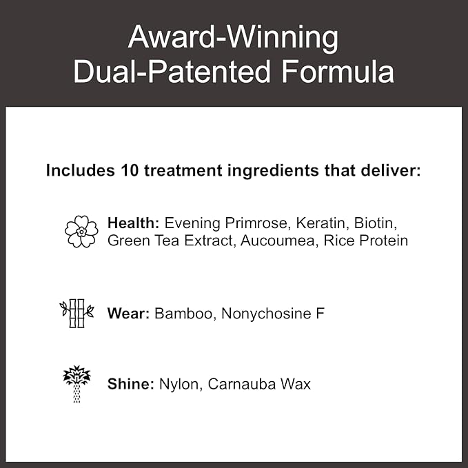 - TREATMENT ENRICHED FORMULA: This dual-patented nail polish formula delivers health, wear and shine with 10 exclusive ingredients to ensure optimum well-being and benefits for the nails. Requires no lamps or tools.