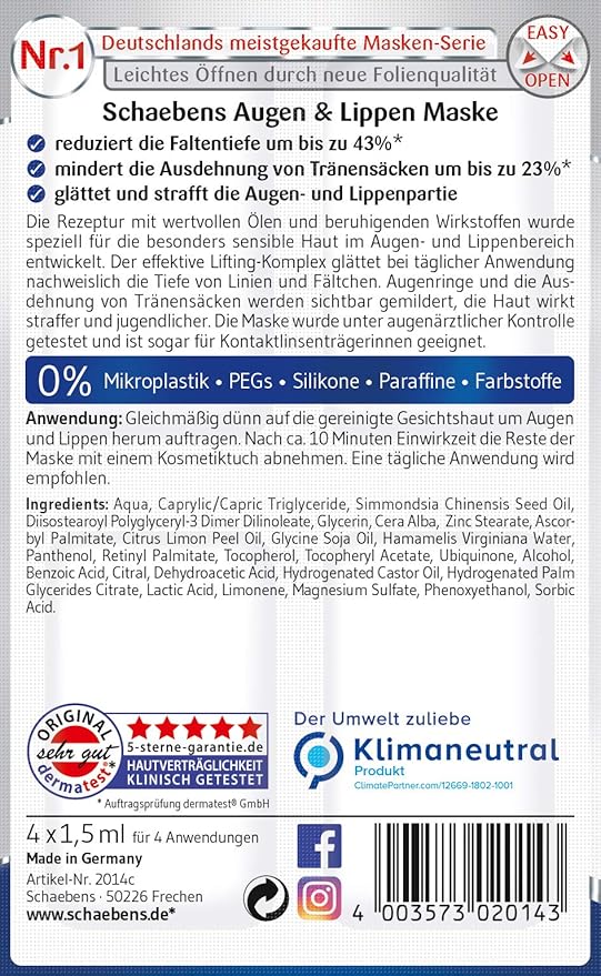 - Product Benefits : The Schaebens eye and lip mask contains Q10, jojoba oil, panthenol, vitamin E and witch hazel. Dark circles and bags under the eyes are softened and wrinkles reduced. For noticeably firmer and smoother skin around the eyes and lips The Schaebens eye and lip mask contains Q10, jojoba oil, panthenol, vitamin E and witch hazel. Dark circles and bags under the eyes are softened and wrinkles reduced. For noticeably firmer and smoother skin around the eyes… See more