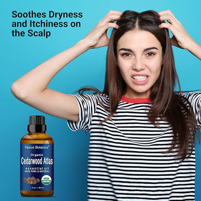 - Hair Care: Organic Cedarwood essential oil soothes itchiness, dryness and irritations on the scalp. It cleanses dirt and excess oils, enabling visibly stronger and shinier hair. Cedarwood oil for hair growth!