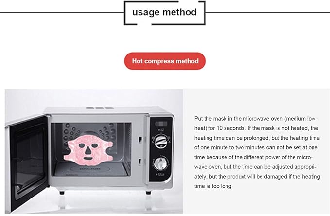 - Cold Hot Therapy: Using the principle of physical therapy, wearing the gel face mask after heating or cooling for 8-15min to help you relieve fatigue and stress. For cold therapy,place it in the refrigerator for about 1-2h; for heat therapy, place it in a microwave oven and heat it for 10-20s.