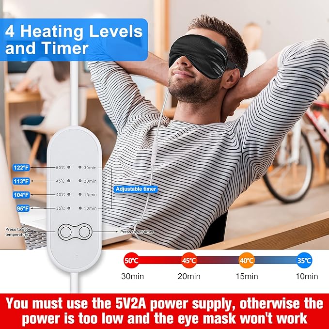 - What you get: You will get 2 silk heated eye masks and 2 USB cables, our heated eye masks can provide continuous heat to relieve eye fatigue and get a more comfortable sleep; Warm Tips: You must use a 5V2A power supply, otherwise the power is too low and the eye mask will not work