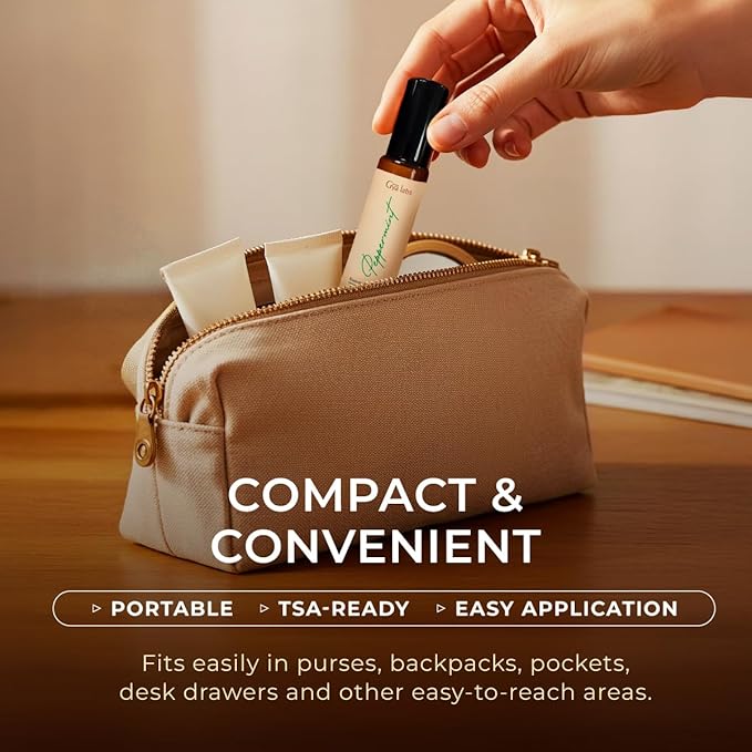- Aromatherapy Oil On-the-Go: Our peppermint oil roll-on is compact and TSA-ready, easily fitting in your bag or pocket. Apply to temples, under the nose, feet, or wrists for a refreshing boost anytime, anywhere.