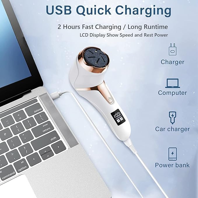 - Rechargeable, Long-Lasting, Easy to Use ----Included USB charging cable, This electric foot file can be charged via any USB port, and have a long runtime 2hours after full charged .and this dead skin remover for feet have LCD Power display let you clear know the rest power it left. remind you charge in time
