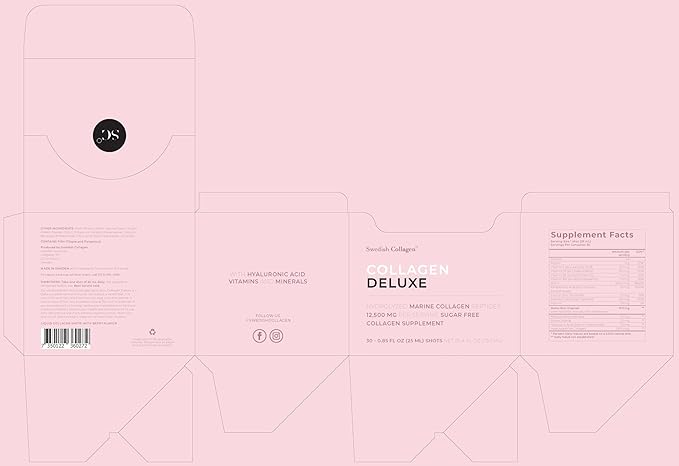 Swedish Collagen Deluxe | 12,500 mg Hydrolyzed Marine Collagen Liquid Supplement - 30 x 25 ml Daily Shots | Hyaluronic Acid, Biotin and Vitamin C for Healthy Hair, Skin, Nails and Joints | Sugar-Free