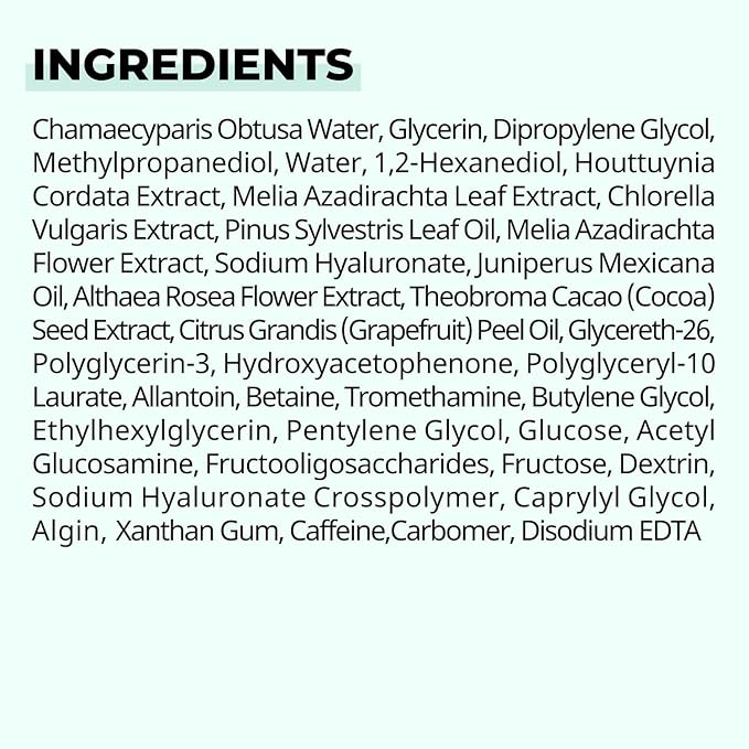 - [NATURAL INGREDIENTS] Infused with Cypress Water from Jeju Island and Heartleaf Extract, it calms and soothes irritated skin, providing a refreshing and relaxing experience.