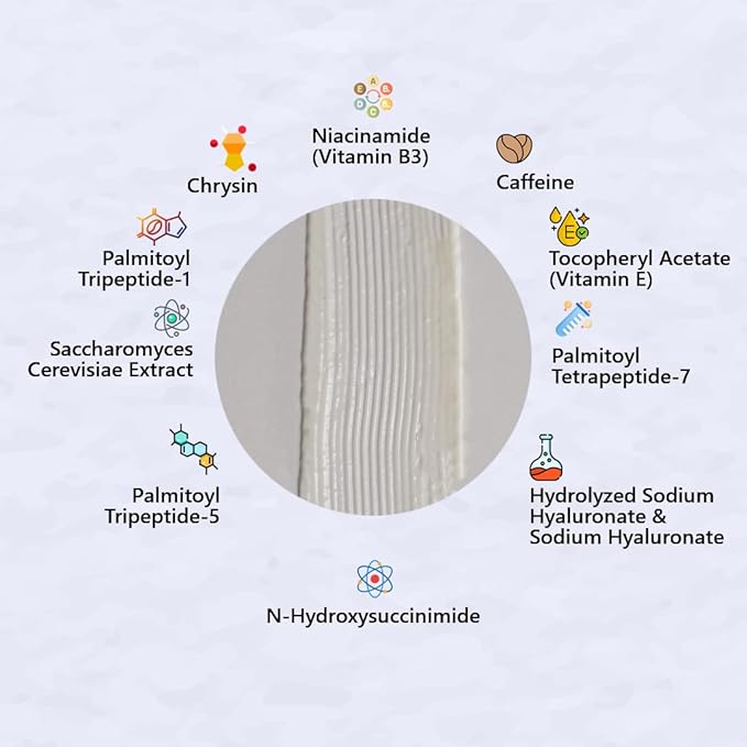 - Active Ingredients : Saccharomyces Cerevisiae Extract, Niacinamide (Vitamin B3), Caffeine, Hydrolyzed Sodium Hyaluronate (Hyaluronic Acid), Tocopheryl Acetate (Vitamin E), Allantoin, Sodium Hyaluronate (Hyaluronic Acid), Palmitoyl Tripeptide-5, Palmitoyl Tripeptide-1, Palmitoyl Tetrapeptide-7. Saccharomyces Cerevisiae Extract, Niacinamide (Vitamin B3), Caffeine, Hydrolyzed Sodium Hyaluronate (Hyaluronic Acid), Tocopheryl Acetate (Vitamin E), Allantoin, Sodium Hyaluronate (Hyaluronic Acid), Palmitoyl Triโฆ See more