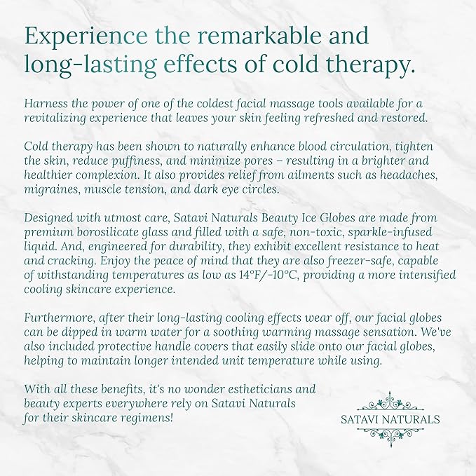 - Soothing Facial Treatment: Experience the ultimate rejuvenation for your skin with Satavi Naturals' exquisite Beauty Ice Globes. Part of our Home Spa Collection, these professional-grade esthetician facial tools offer a spa-like experience in the comfort of your own home.