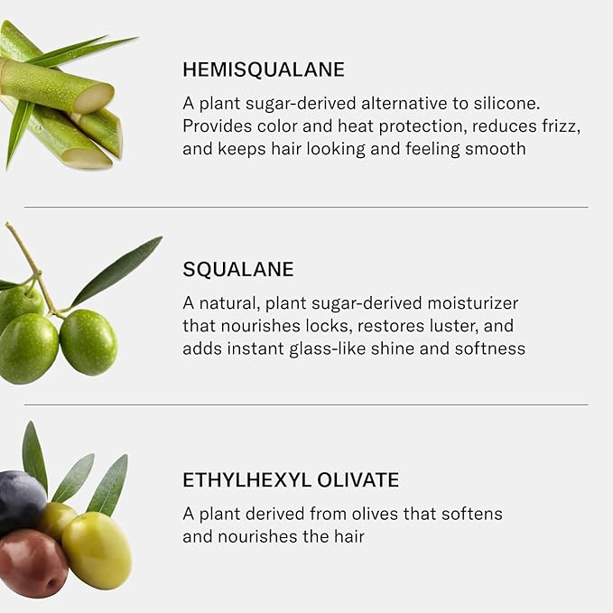 - KEY INGREDIENTS: Hemisqualane provides color and heat protection, reduces frizz, and keeps hair looking and feeling smooth. Squalane is a natural, plant sugar-derived moisturizer that nourishes locks, restores luster, and adds instant glass-like shine and softness. Ethylhexyl olivate (derived from olives) softens and nourishes the hair