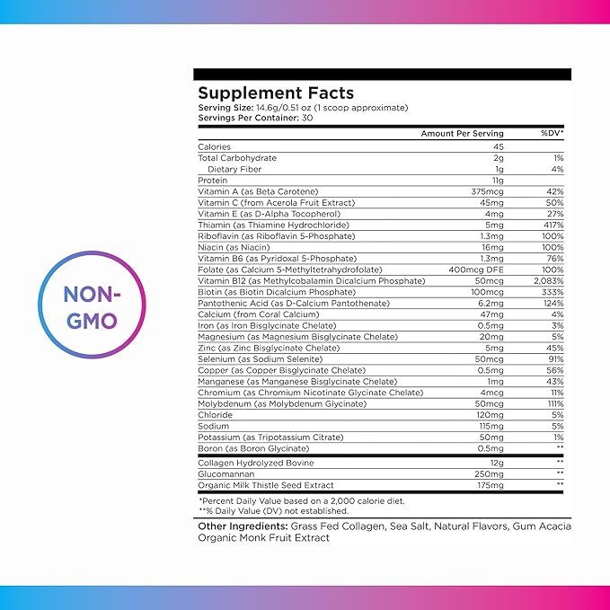 - Special Ingredients : Vitamin A (as Beta Carotene), Vitamin C (from Acerola Fruit Extract), Vitamin E (as D-Alpha Tocopherol), Thiamin (as Thiamine Hydrochloride), Riboflavin (as Riboflavin 5-Phosphate), Niacin (as Niacin), Vitamin B6 (as Pyridoxal 5-Phosphate), Folate (as Calcium 5-Methyltetrahydrofolate), Vitamin B12 (as Methylcobalamin Dicalcium Phosphate), Biotin (as Biotin Dicalcium Phosphate), Pantothenic Acid (as D-Calcium Pantothenate), Calcium (from Coral Calcium), Iron (as Iron Bisglycinate Chelate), Magnesium (as Magnesium Bisglycinate Chelate), Zinc (as Zinc Bisglycinate Chelate), Selenium (as Selenium Chelate), Copper (as Copper Bisglycinate Chelate), Manganese (as Manganese Bisglycinate Chelate), Chromium (as Chromium Nicotinate Glycinate Chelate), Molybdenum (as Molybdenum Glycinate), Chloride, Sodium, Potassium (as, Tripotassium Citrate), Boron (as Boron Glycinate), Collagen Hydrolyzed Bovine, Glucomannan, Organic Milk Thistle Seed Extract, Grass Fed Collagen, Sea Salt, Natural Flavors, Gum Acacia, Organic Monk Fruit Extract Vitamin A (as Beta Carotene), Vitamin C (from Acerola Fruit Extract), Vitamin E (as D-Alpha Tocopherol), Thiamin (as Thiamine Hydrochloride), Riboflavin (as Riboflavin 5-Phosp… See more