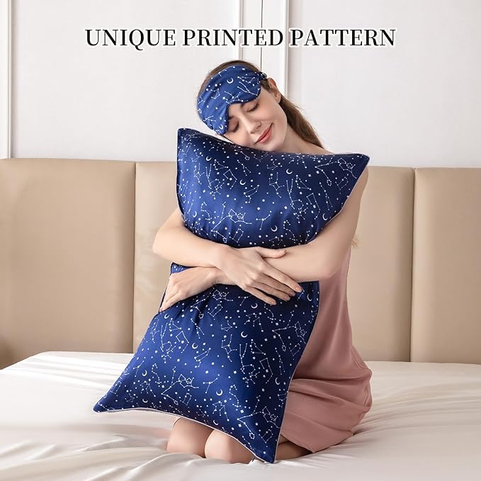 THXSILK Sleep Mask 100% 19 Momme Pure Mulberry Silk Super Smooth Cooling Decorative Sleep Eye Mask Blackout Eye Cover with Wide Head Strap, Constellation-Navy
