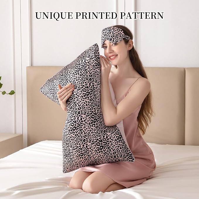 THXSILK Sleep Mask 100% 19 Momme Pure Mulberry Silk Super Smooth Cooling Decorative Sleep Eye Mask Blackout Eye Cover with Wide Head Strap, Leopard-Pink