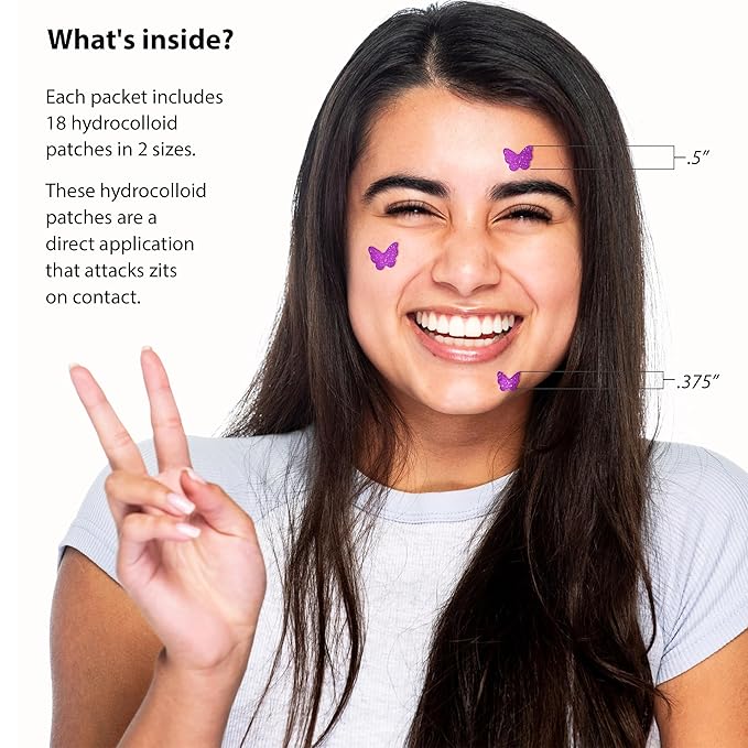- HANDS OFF YOUR PIMPLES!: I know, I know, it’s hard to leave them alone but that’s where these adorable purple butterfly shaped patches come in. Send those zits packing (without picking) and soothe your skin while you treat your acne.