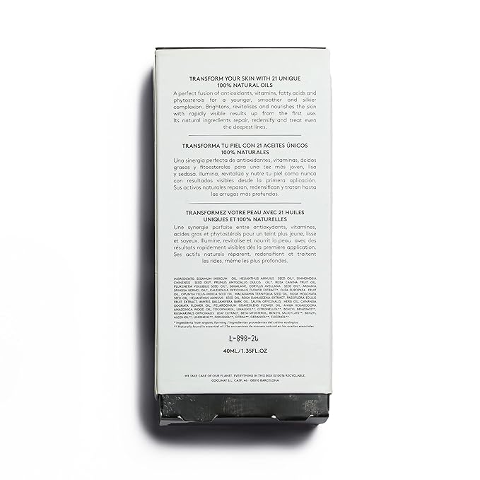 - INGREDIENTS | 21 transforming oils with antioxidants, vitamins and Bakuchiol, known as natural retinol that reduces fine lines, improves elasticity and enhances skin texture and smoothness.