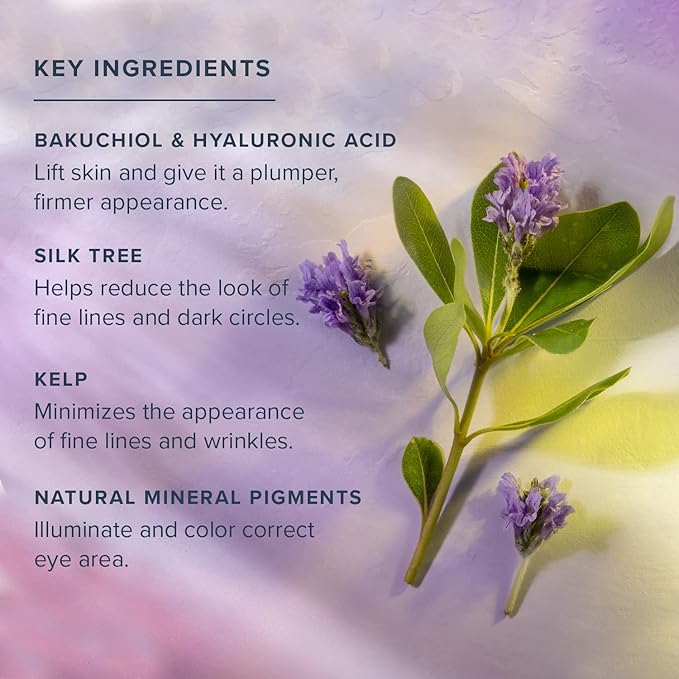 - Day & Night Formula: Wear it all day under makeup or as a night eye cream to help reduce the appearance of eye bags and dark circles. Hyaluronic Acid and Bakuchiol hydrate and lift for firmer-looking skin, while Silk Tree and Kelp soften the look of fine lines around the eyes.