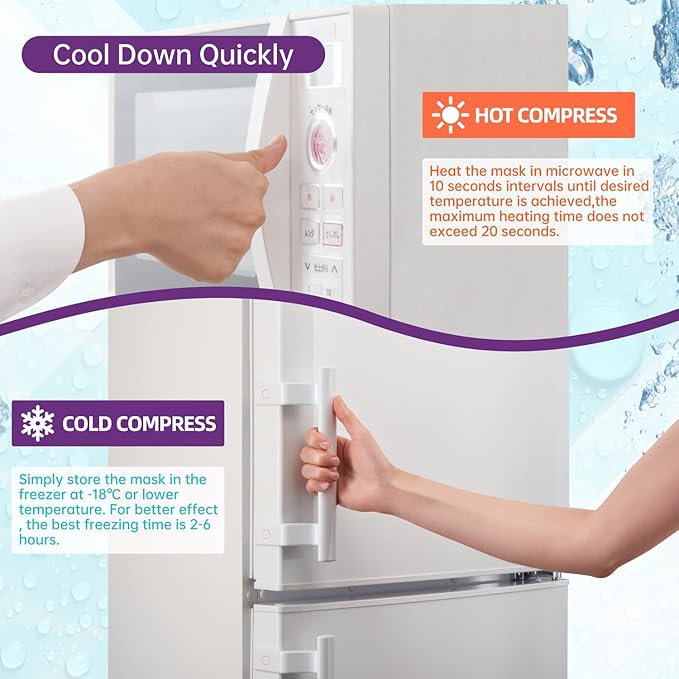 - 【CONVENIENT TO USE】Sealed the eye mask in a plastic bag and simply store the mask in the freezer at -18℃ or lower temperature for at least 1 hours. For better effect,the best freezing time in the freezer is 2-6 hours .For heat therapy,heat the mask in microwave in 10 seconds intervals until desired temperature is achieved,the maximum heating time does not exceed 20 seconds. And the best therapy time is approximately 15 minutes recommended by doctor and therapist.