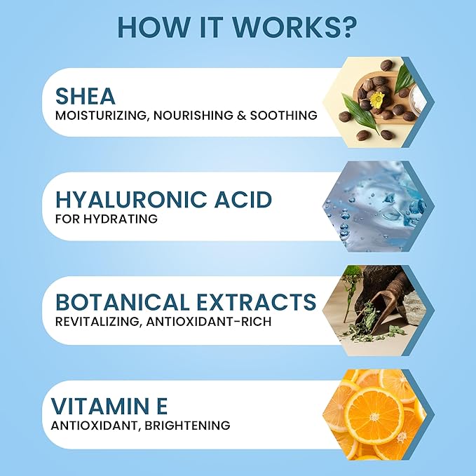 - ๐ ANTI-AGING FORMULA: Contains Hyaluronic Acid and Shea Butter to smooth wrinkles and fine lines, promoting youthful skin.