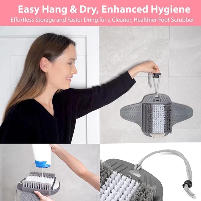 - Considerate Design with Built-In Hook & Non-Slip - Experience ultimate safety and durability with this feet callus remover. The strong suction cups and anti-slip base ensure a secure grip on any surface, while the side flaps help you maintain balance during use. With its sturdy bristles, this exfoliator will keep your feet clean and healthy for a long time. The built-in hook enables easy drying and convenient storage.