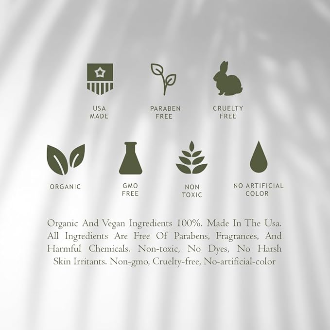 - ๐ข๐ฟ๐ด๐ฎ๐ป๐ถ๐ฐ ๐๐ป๐ฑ ๐ฉ๐ฒ๐ด๐ฎ๐ป ๐๐ป๐ด๐ฟ๐ฒ๐ฑ๐ถ๐ฒ๐ป๐๐ ๐ญ๐ฌ๐ฌ%. Made in the USA. All ingredients are free of parabens, fragrances and harmful chemicals. Non-toxic, No dyes, No harsh skin irritants. Non-GMO, Cruelty free, No-artificial-color