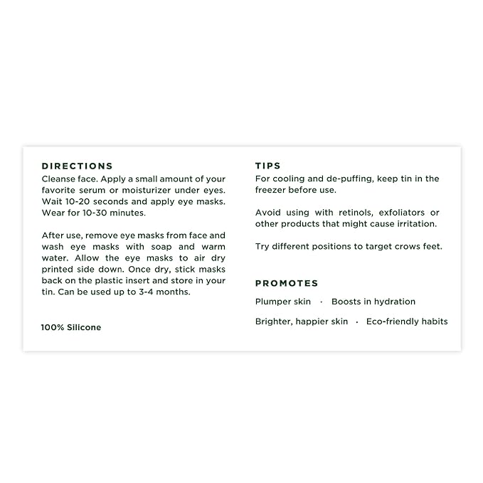 - Directions: Cleanse face. Apply a small amount of your favorite serum or moisturizer under eyes. Wait 10-20 seconds and apply eye masks. Wear for 10-30 minutes. After Use, remove eye masks from face and wash eye masks with soap and warm water. Allow the eye masks to air dry printed side down. Once dry, stick masks back on the plastic insert and store in your tin. Can be used up to 3-4 months.