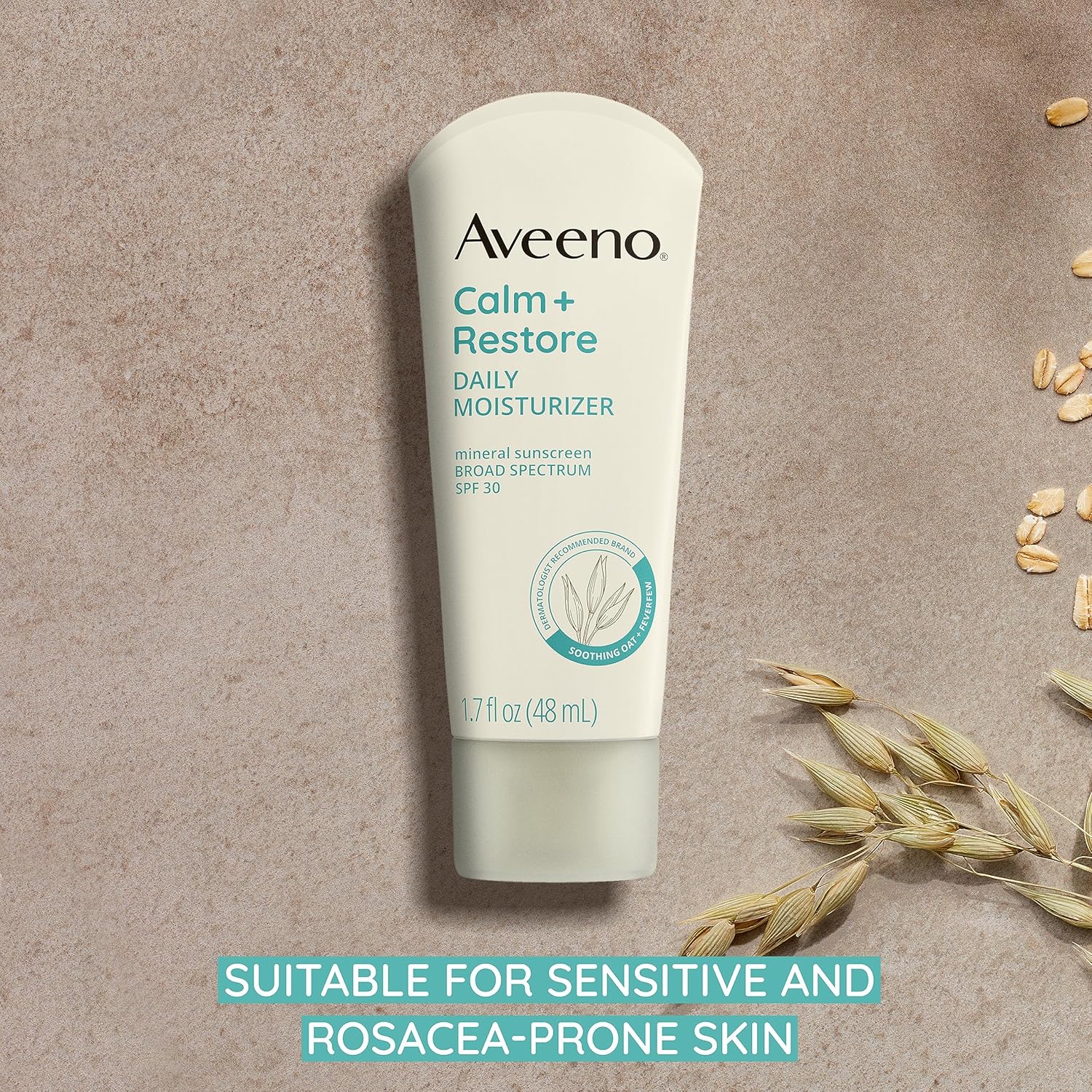 - 1.7-fluid ounces of Aveeno Calm + Restore Daily Moisturizer Mineral Sunscreen with Broad Spectrum SPF 30 for lightweight, all-day moisture for sensitive skin plus protection from the sun & harmful UVA/UVB rays