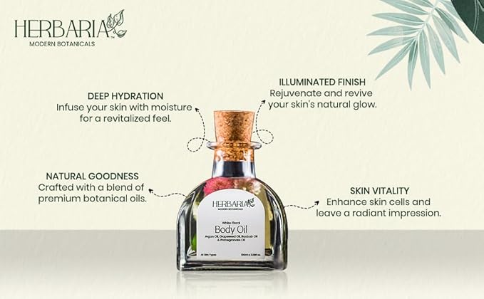 HERBARIA Body Oil - White Floral (3.38 fl oz) | Luxurious Body Oil - ALL SEASON | 100% Vegan Enriched With Grapeseed Oil, Pomegranate Oil, Avocado Oil, Argan Oil, Baobab Oil | 100% Sustainable