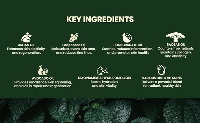 - INGREDIENTS: Almond Oil, Grapeseed Oil, Pomegranate Oil, Avocado Oil, Argan Oil, Baobab Oil, Rosehip Oil, Neroli Oil, Geranium Oil, Vitamin E, CCTG.