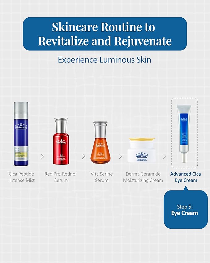 - DR. BELMEUR ADVANCED CICA EYE CREAM (25ml/0.9fl oz) is specially formulated for delicate under-eye skin, offers a soothing solution that minimizes irritation.