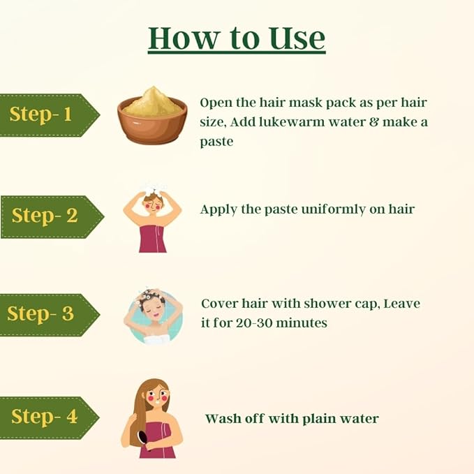 - Ease Of Application: Experience effortless application of our hair mask. Simply mix the hair mask powder for men & women as per hair your length (1 sachet for small hair, 2 sachets for medium hair, 3 sachets for long hair and 4 sachets for extra long hair) with lukewarm water and stir to make creamy paste. Apply the paste uniformly on hair.Cover hair with shower cap. Leave for 15 to 30 min.Wash Off with plain water.