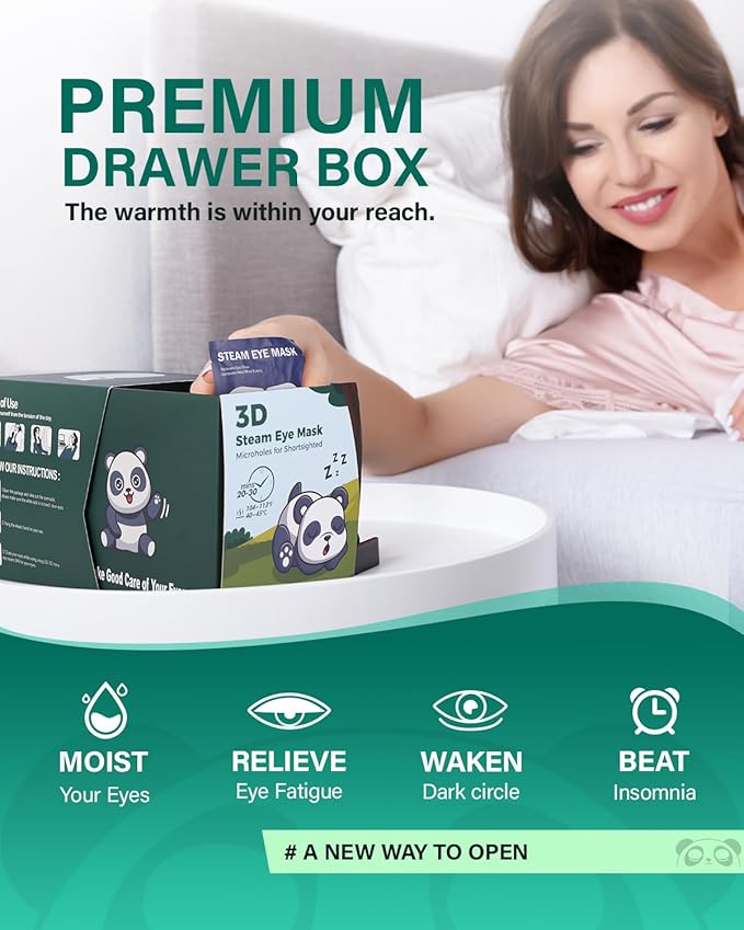 - 【20-30 Mins Dry Eye Relief】Our steam eye masks can relieve your eye fatigue, moisturize your eyes, improve your sleep quality, reduce dry puffy eyes and dark circles. The heated eye mask will promote your blood circulation, release fine moist steam, comfort the skin around eyes, let tired eye enjoy the steam, fully relieve dry eyes and eye astringent with just 30-minute eye spa.