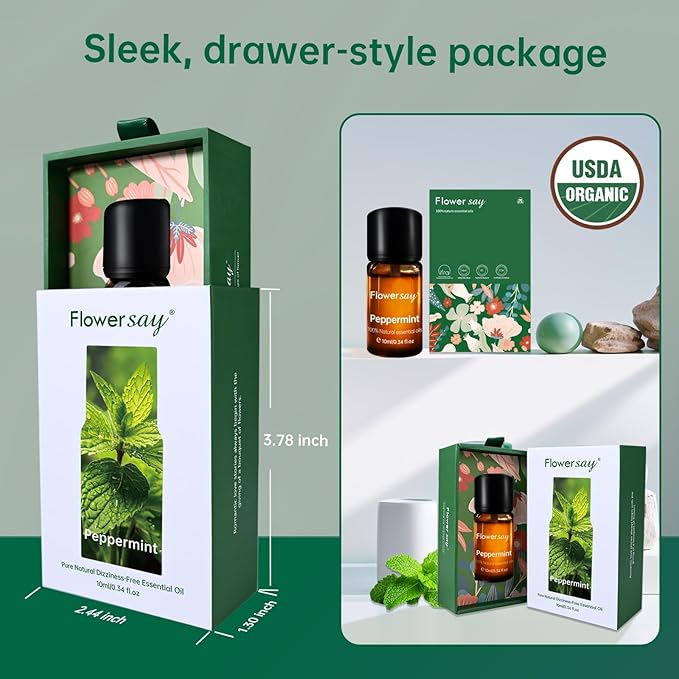 - Invigorating Cooling Sensation & Refreshing Aroma:100% Pure Natural Peppermint Oil for Energy Renewal & Clear Breathing. Apply to temples for 30-second freshness boost or diffuse to awaken your space. Loved for promoting a sense of focus during workouts, travel, or long workdays. Quality you can trust—Flowersay Peppermint Oil is 100% natural and rigorously tested. NOTE:It's for aromatic or topical use only.