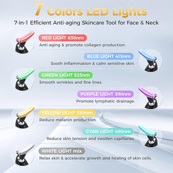 - [7-in-1 Multifunctional Massager] This face neck massager has 7 different LED light modes that are not only suitable for massaging the face, neck but also can be used to massage the arms, shoulders and other body parts, tightening the sagging skin and relaxing the muscles.