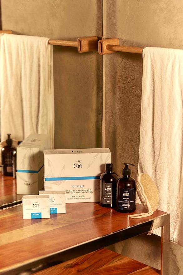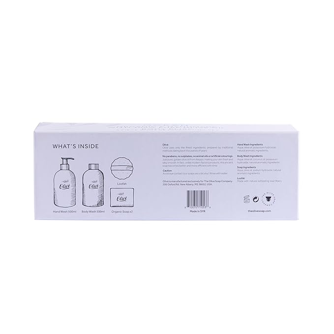 - PAMPER YOURSELF: Experience the refreshing sensation of the ocean with our Olive Gift Box Set. This thoughtfully curated collection includes a lavish 500ml Body Wash and Hand Wash, both infused with an invigorating ocean scent that will transport you to coastal paradise. The two soap bars, each weighing 125g, offer a gentle yet luxurious lather that leaves your skin feeling cleansed and nourished. To complete the set, we've included a Loofah for a spa-like exfoliation experience.
