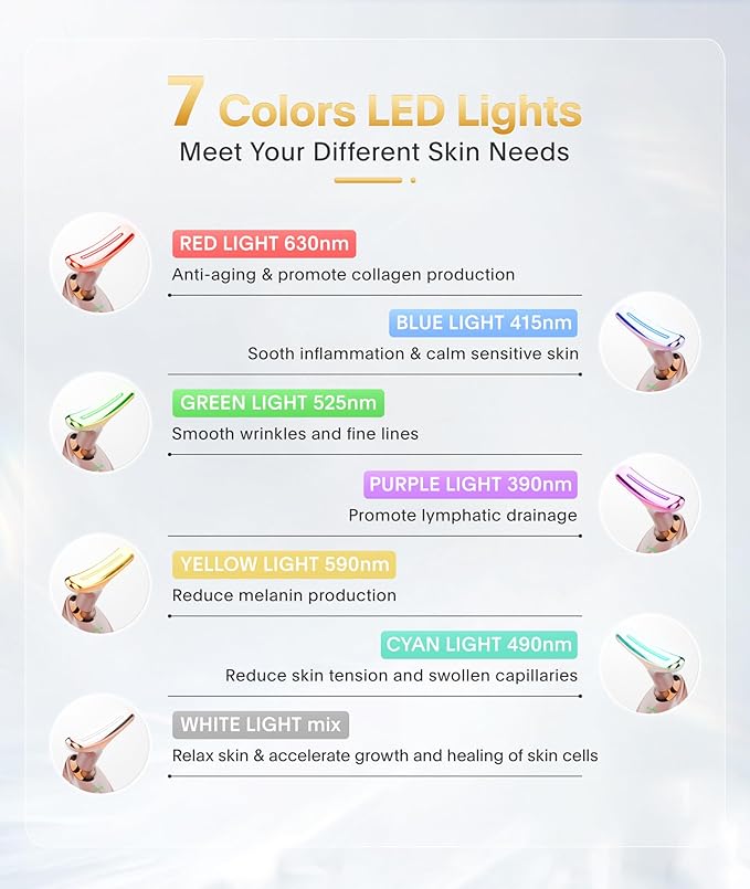 - 7-in-1 Facial Massager - This face neck massager has 7 light modes with various functions that can be used to massage the face and neck with serum, lotion and the like in daily skincare routine. It can also be used on other body parts, tightening the sagging skin and relaxing the muscles.