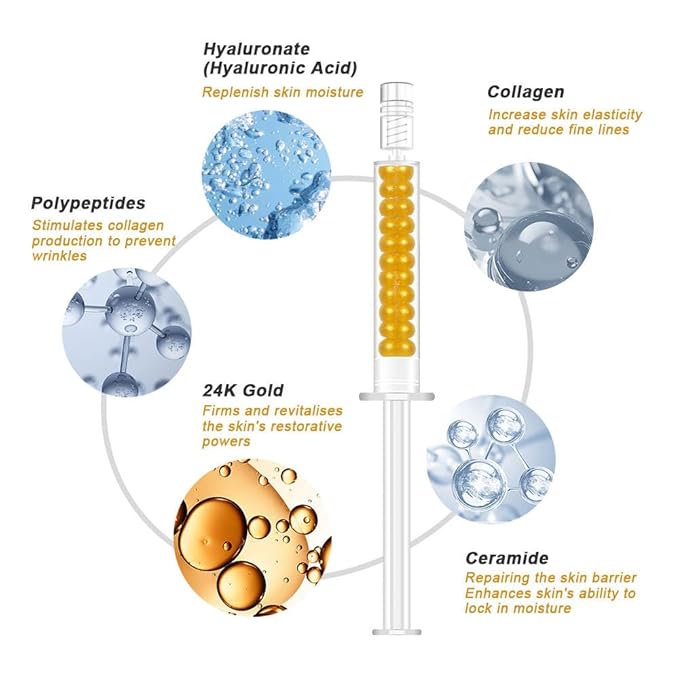- Two no-needle syringes are designed for a controlled dosage over areas of concern like wrinkles, fine-lines, sagging skin, and such over the face, neck, and around the eyes.