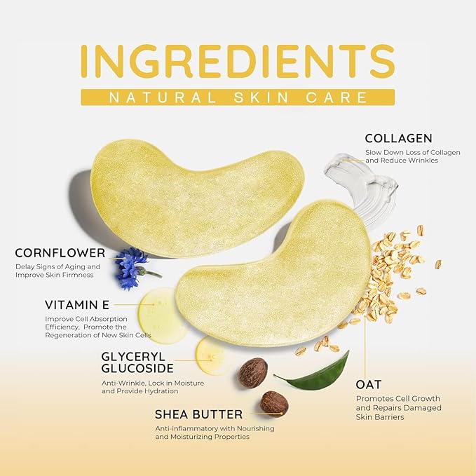 - REPLENISH COLLAGEN UNDER EYES: Keep the skin well-hydrated with our under eye gel pads, containing natural ingredients such as collagen and shea butter that leave a nourishing and moisturizing effect on the skin.