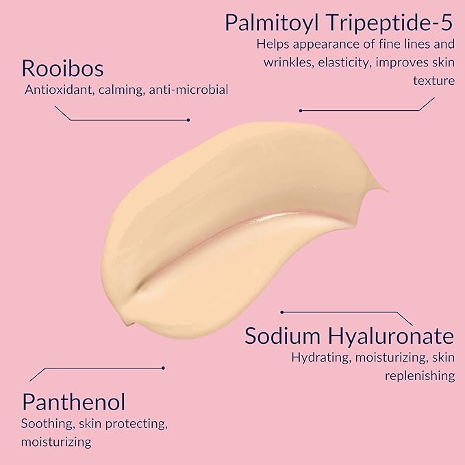 - FORMULATED WITH POWERFUL INGREDIENTS: Infused with Palmitoyl Tripeptide-5 to improve the appearance of fine lines, enhance elasticity, and refine skin texture. Panthenol provides soothing and protective benefits, keeping the skin moisturized. Rooibos contributes antioxidant properties, calms, soothes, and moisturizes, while Sodium Hyaluronate deeply hydrates, replenishes, and supports skin health