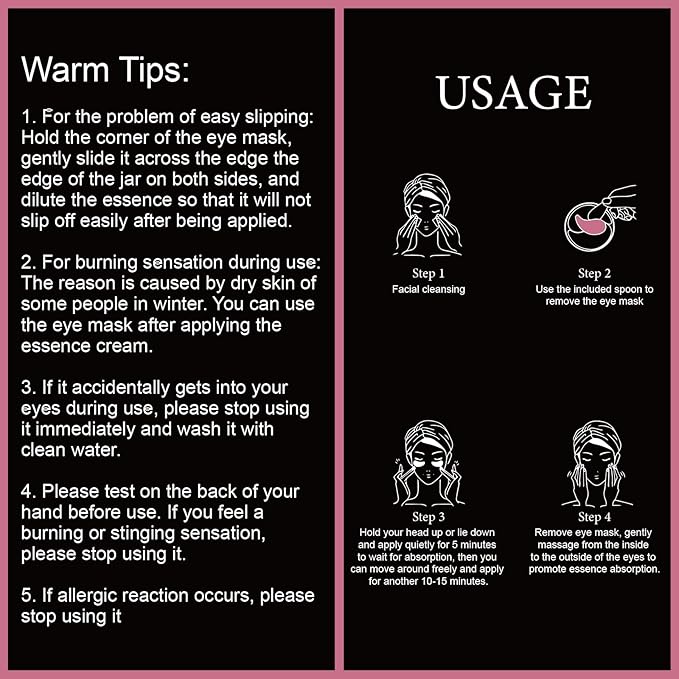 - 【Easy To Apply】Clean your face and eyes with warm water, gently place eye pads under your eyes and press. After 15 minutes remove the eye pads and gently pat the remaining essence. Use yourself or as a gift for any occasion.
