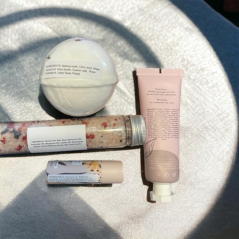 Natural Amor Handmade Spa Gifts for Women, Thank you Gift, 5pcs Gift Set for Women,Includes Bath Salt, Bath Bomb, Lip Balm