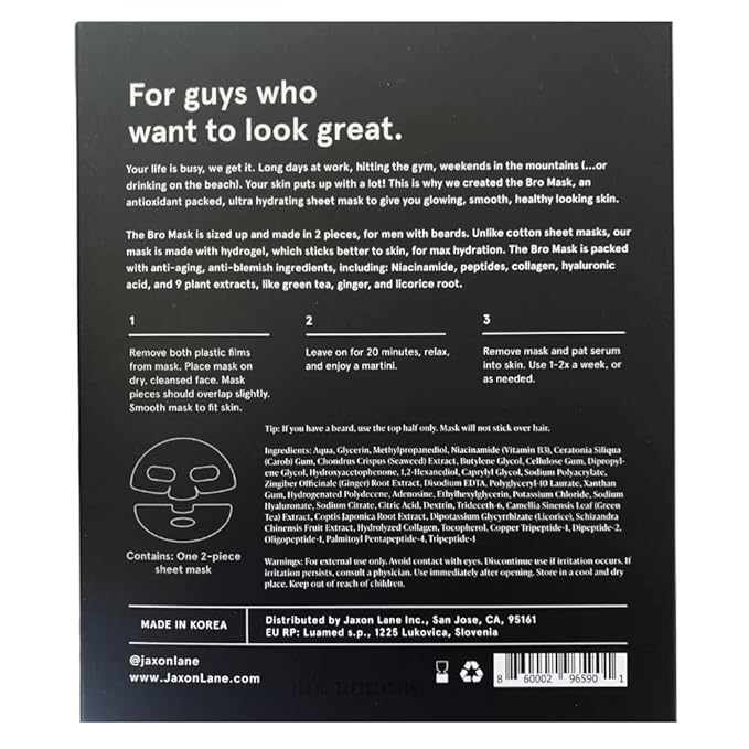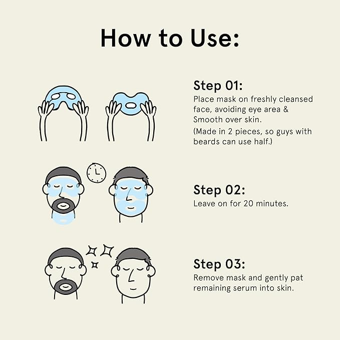 - ⭐ EXTRA LARGE FACE MASK FOR MEN: Our large, durable face mask sheets won’t tear on application. They’re AWARD WINNING –Rated best face mask by Men's Health, New York Magazine, Gear Patrol & The Manual; our collagen face mask wont strip face oil but is an ultra hydrating face mask sheet that helps regulate sebum production. Who says beauty and skin care are for women? This hydrogel clear mask beats a paper mask & finally solves the beard struggle –A face mask for bearded men! (2 Pcs)